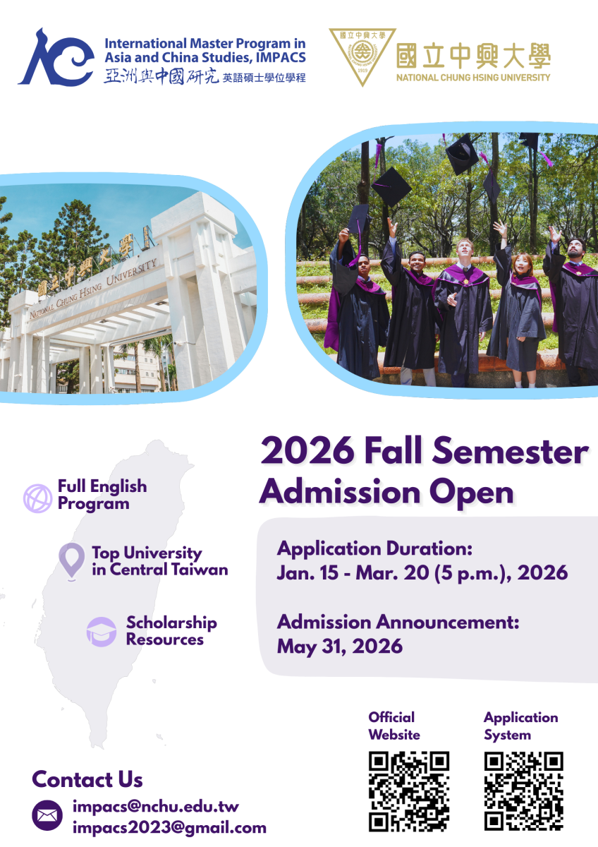 📅Application Period: January 15 – March 20, 2026 (5:00 p.m.) 📅Admission Results: May 31, 2026 📅Program Start: September 2026 🔎Application URL: NCHU – Overseas student admission 📬Email: impacs@nchu.edu.tw The International Master Program in Asia and China Studies (IMPACS) is fully taught in English. Whether your interests lie in Politics, Security, History, Regional studies, or Culture, studying at a TOP UNIVERSITY in Central Taiwan offers you a dynamic, multidisciplinary environment. Students benefit not only from academic training, but also from building a diverse, international network with peers, scholars, and professionals from around the world. 🗺️
