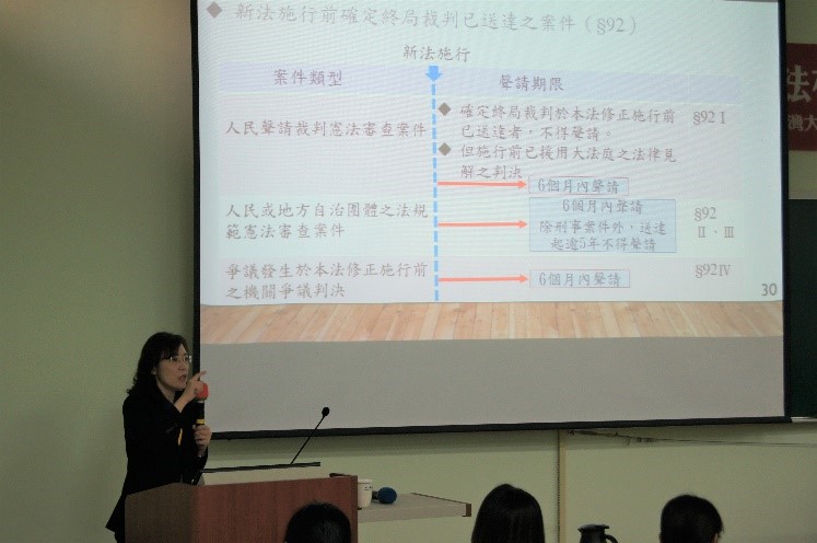 為使我國憲法訴訟制度更趨完整,111年即將採行之「裁判憲法審查」制度,為司法改革重要之一環,以周全保障人民憲法上之權利。本研討會第一場發表人為最高行政法院王碧芳法官,主講憲法訴訟新制,指出修法重點在於大法官審理案件的全面法庭化與裁判化。目前大法官係以會議形式作成解釋或決議,但此種方式容易使人誤會非司法權之行使,因此修改為以憲法法庭之名義為裁判。此外,大法官審理案件之類型,也有重大變革,如「裁判憲法審查」和憲法增修條文中「總統、副總統彈劾」之納入,以及「法院聲請法規範審查」之實務明文化。鑒於憲法作為人民權利保護的最後一道防線,憲法訴訟制度之改革有其必要性,也為我國司法史上創下重大的里程碑。