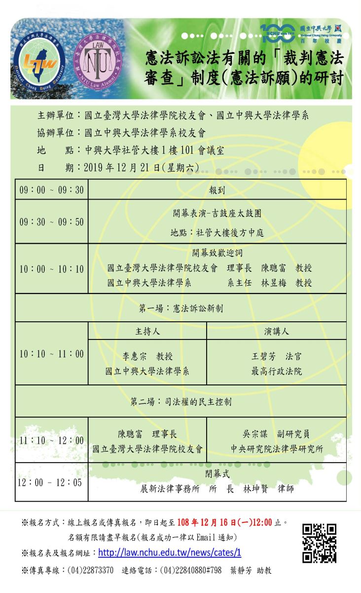 本次憲法訴訟法有關的「裁判憲法審查」制度(憲法訴願)研討會,由國立臺灣大學法律學院校友會與國立中興大學法律學系共同舉辦,為中興大學法律學系慶祝百年校慶系列活動之一,特別感謝國立中興大學法律學系校友會協辦。活動開始由何志楊律師領軍的「吉鼓座太鼓團」為本次活動展開熱鬧的開幕表演,並由臺灣大學法律學院校友會陳聰富理事長及中興大學法律學系林昱梅系主任為本次研討會開幕致詞。此次研討會的與會人員相當多元,包含台灣法學會陳彥希理事長、多位臺灣大學法律學院校友會理監事、資深法官、檢察官,以及多位律師、會計師、技士及社工師等前來參與,使本次研討會在學術與實務的相互交流下,激盪出絢爛的火花。