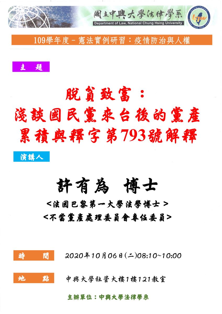 【Speech】2020.10.06(Tue.)Get Rid Of Poverty and Become Rich:Brief Discussion on the Accumulation of Party Assets After the KMT Came to Taiwan and the Explanation of No.793.