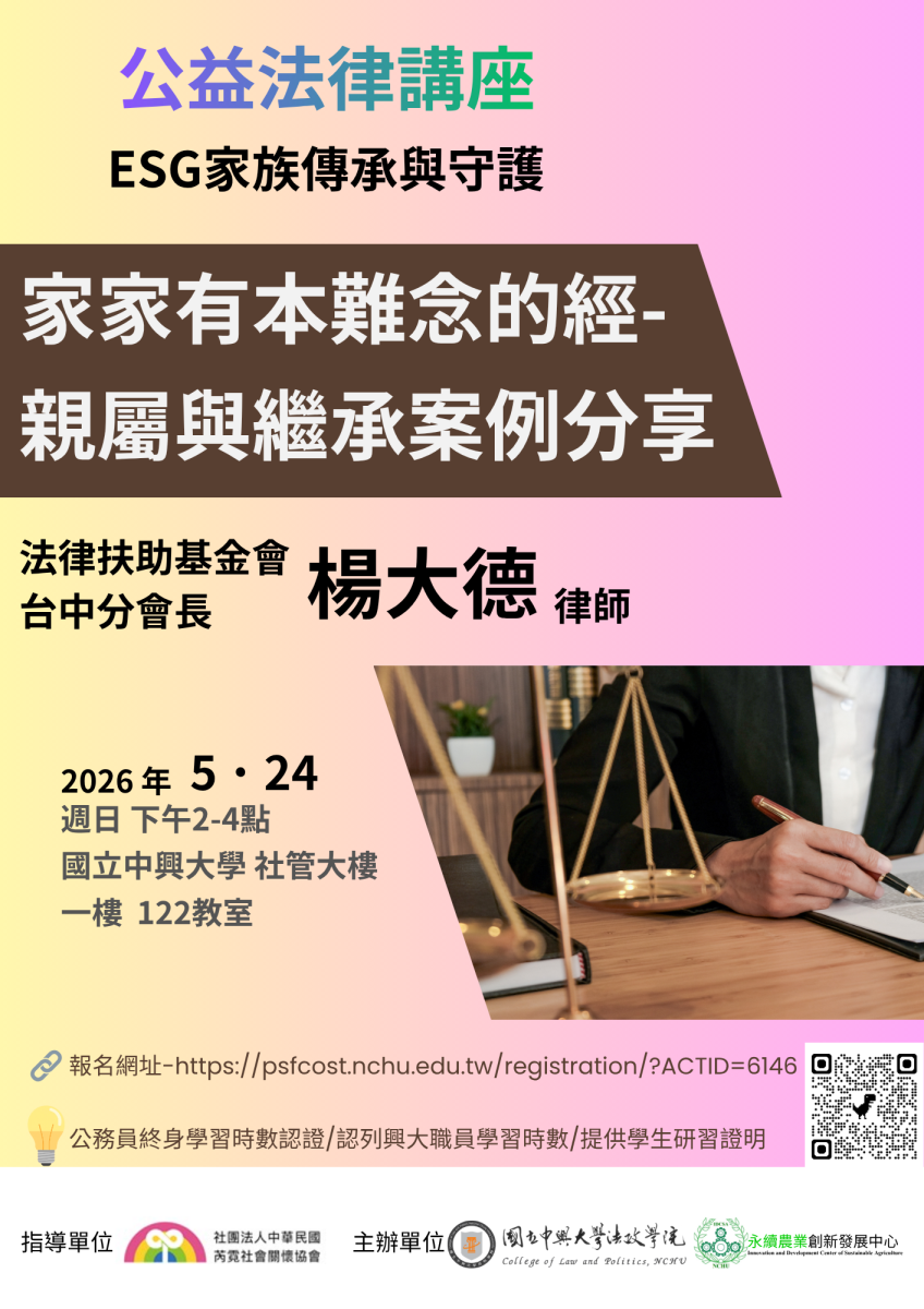 講者:財團法人法律扶助基金會台中分會會長-楊大德律師。 題目:家家有本難唸的經-親屬與繼承案例分享。 時間:115年5月24日(日)下午2-4點。 地點:國立中興大學社管大樓122教室。 指導單位:社團法人中華民國芮霓社會關懷協會。 主辦單位:國立中興大學法政學院、國立中興大學永續農業創新發展中心。 提供公務員終身學習時數認證/認列興大職員學習時數/提供高中生研習證明。